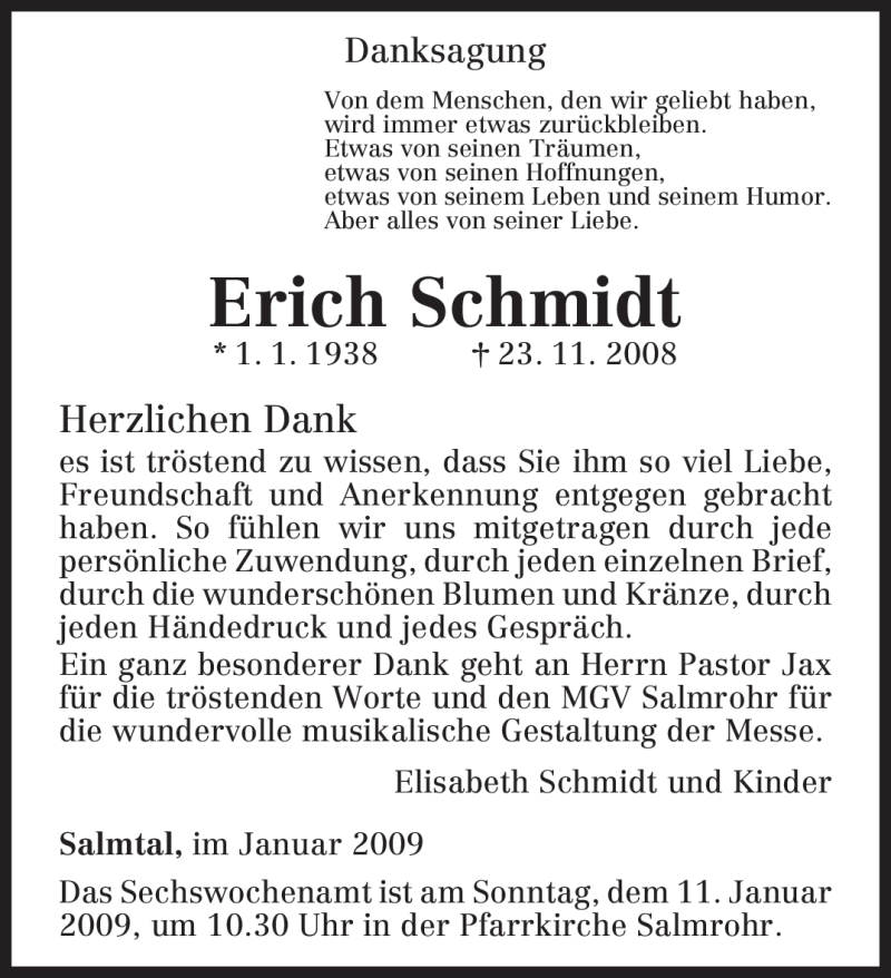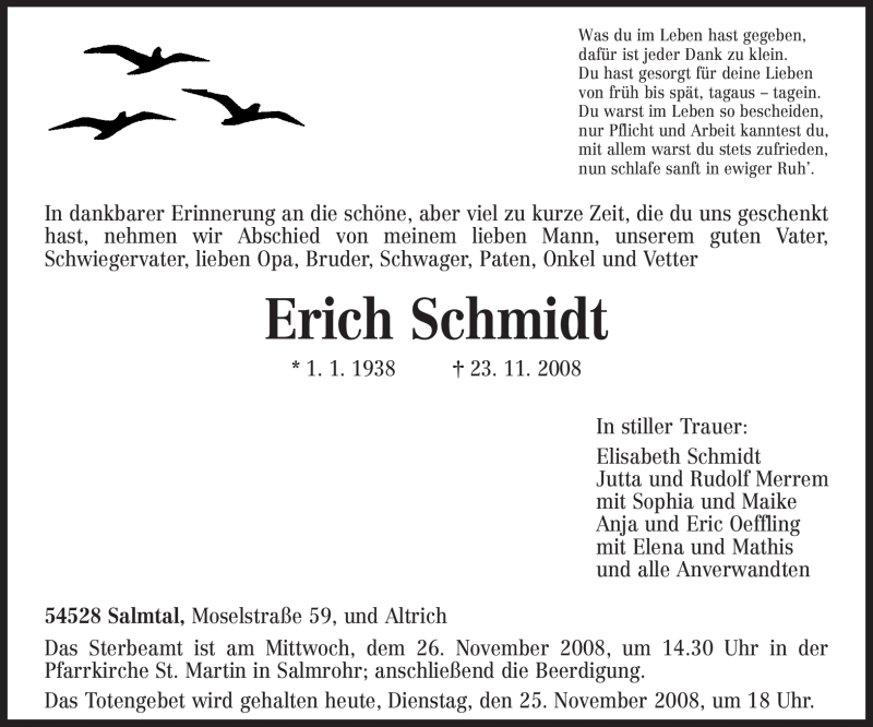 Hier finden Sie alle Traueranzeigen aus der Zeitung, die bisher für Erich Schmidt erschienen sind. Weitere Traueranzeigen, die in der Zeitung erscheinen, werden hier ebenfalls aufgelistet