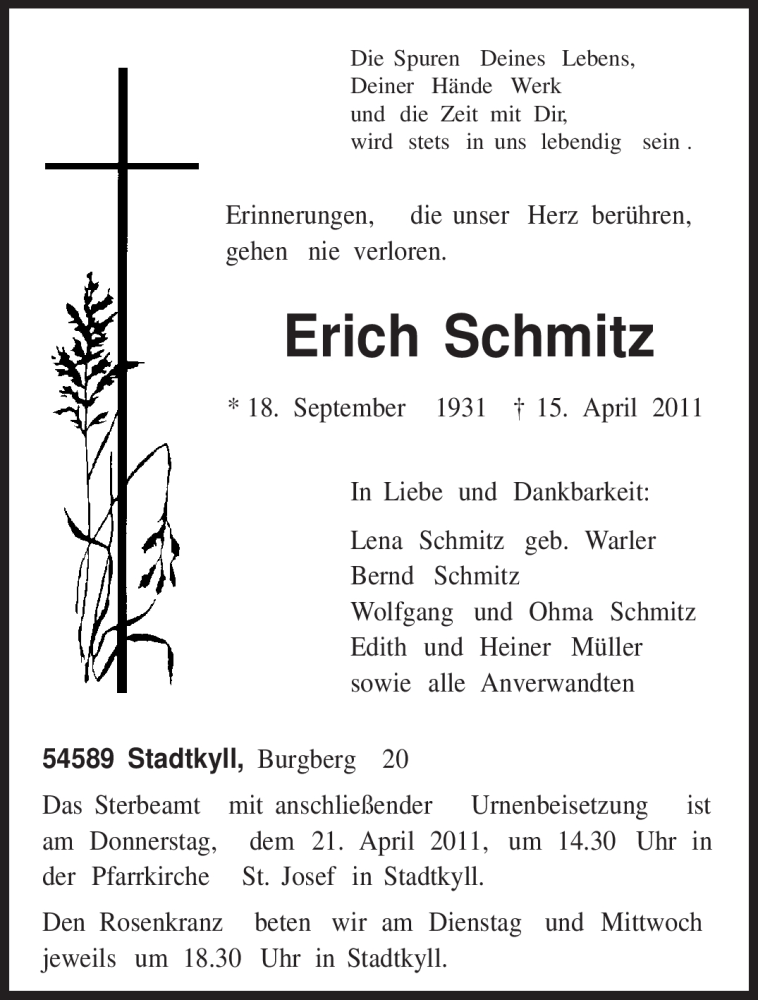 Hier finden Sie alle Traueranzeigen aus der Zeitung, die bisher für Erich Schmitz erschienen sind. Weitere Traueranzeigen, die in der Zeitung erscheinen, werden hier ebenfalls aufgelistet