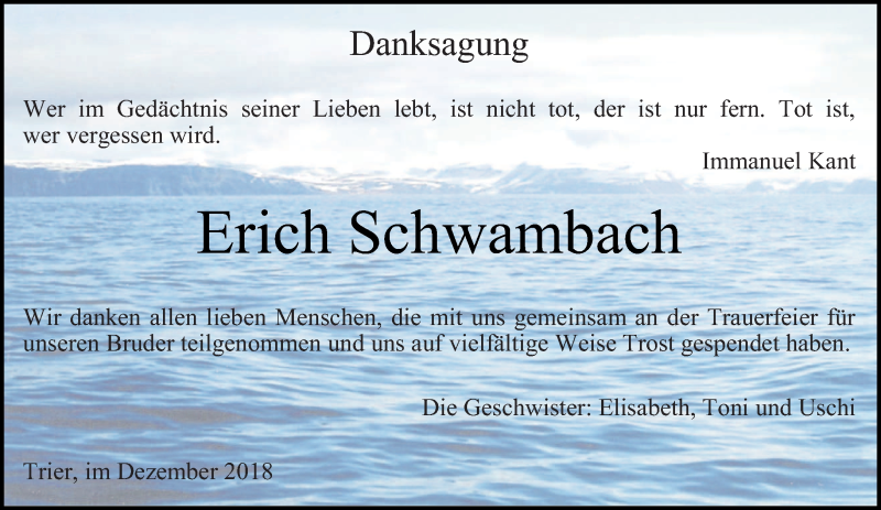 Hier finden Sie alle Traueranzeigen aus der Zeitung, die bisher für Erich Schwammbach erschienen sind. Weitere Traueranzeigen, die in der Zeitung erscheinen, werden hier ebenfalls aufgelistet
