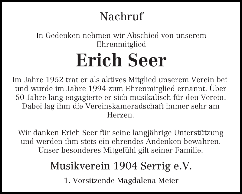 Hier finden Sie alle Traueranzeigen aus der Zeitung, die bisher für Erich Seer erschienen sind. Weitere Traueranzeigen, die in der Zeitung erscheinen, werden hier ebenfalls aufgelistet