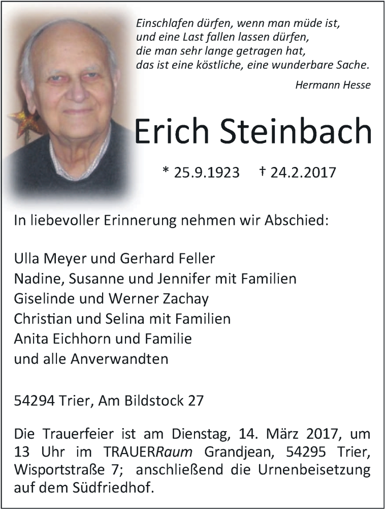 Hier finden Sie alle Traueranzeigen aus der Zeitung, die bisher für Erich Steinbach erschienen sind. Weitere Traueranzeigen, die in der Zeitung erscheinen, werden hier ebenfalls aufgelistet
