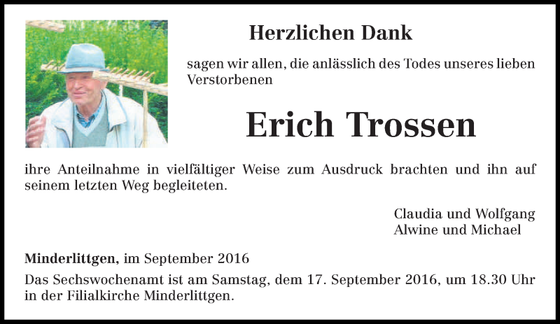Hier finden Sie alle Traueranzeigen aus der Zeitung, die bisher für Erich Trossen erschienen sind. Weitere Traueranzeigen, die in der Zeitung erscheinen, werden hier ebenfalls aufgelistet