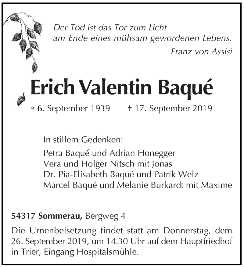 Hier finden Sie alle Traueranzeigen aus der Zeitung, die bisher für Erich Valentin Baque erschienen sind. Weitere Traueranzeigen, die in der Zeitung erscheinen, werden hier ebenfalls aufgelistet