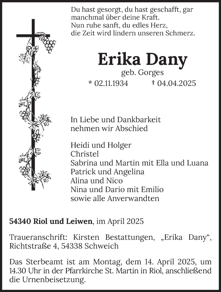 Hier finden Sie alle Traueranzeigen aus der Zeitung, die bisher für Erika Dany erschienen sind. Weitere Traueranzeigen, die in der Zeitung erscheinen, werden hier ebenfalls aufgelistet