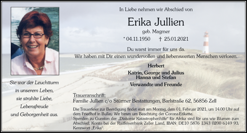 Hier finden Sie alle Traueranzeigen aus der Zeitung, die bisher für Erika Jullien erschienen sind. Weitere Traueranzeigen, die in der Zeitung erscheinen, werden hier ebenfalls aufgelistet