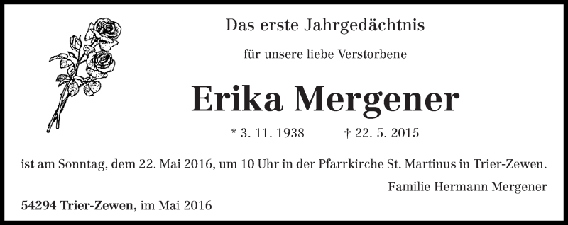 Hier finden Sie alle Traueranzeigen aus der Zeitung, die bisher für Erika Mergener erschienen sind. Weitere Traueranzeigen, die in der Zeitung erscheinen, werden hier ebenfalls aufgelistet