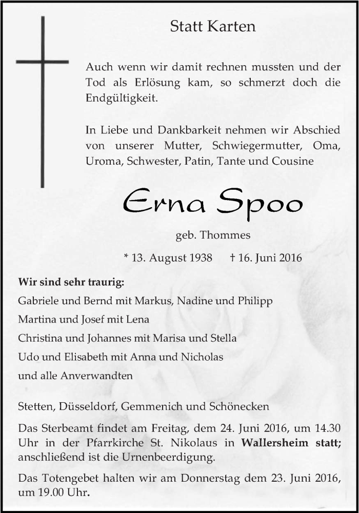 Hier finden Sie alle Traueranzeigen aus der Zeitung, die bisher für Erna Spoo erschienen sind. Weitere Traueranzeigen, die in der Zeitung erscheinen, werden hier ebenfalls aufgelistet