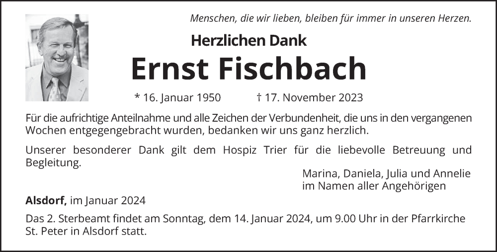 Hier finden Sie alle Traueranzeigen aus der Zeitung, die bisher für Ernst Fischbach erschienen sind. Weitere Traueranzeigen, die in der Zeitung erscheinen, werden hier ebenfalls aufgelistet