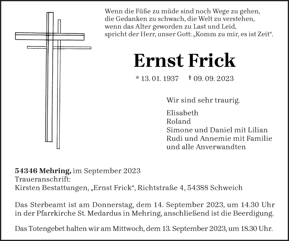 Hier finden Sie alle Traueranzeigen aus der Zeitung, die bisher für Ernst Frick erschienen sind. Weitere Traueranzeigen, die in der Zeitung erscheinen, werden hier ebenfalls aufgelistet