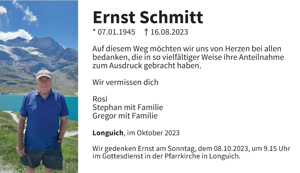 Hier finden Sie alle Traueranzeigen aus der Zeitung, die bisher für Ernst Schmitt erschienen sind. Weitere Traueranzeigen, die in der Zeitung erscheinen, werden hier ebenfalls aufgelistet