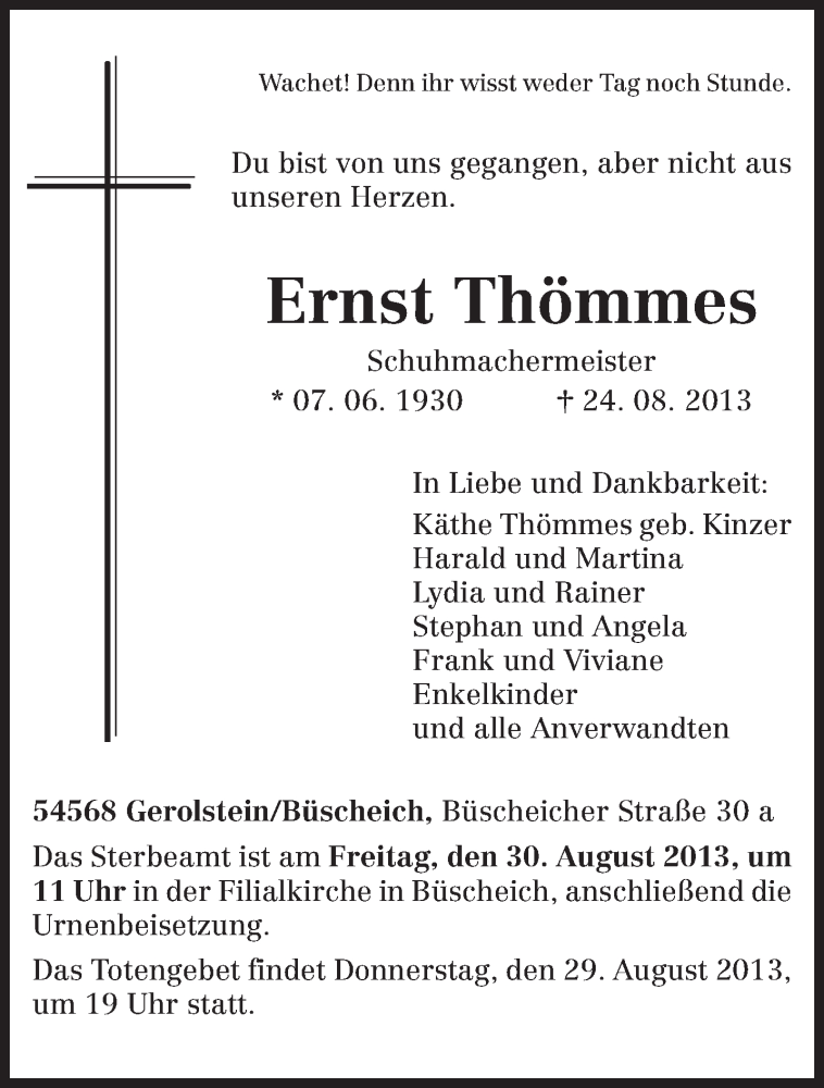 Hier finden Sie alle Traueranzeigen aus der Zeitung, die bisher für Ernst Thömmes erschienen sind. Weitere Traueranzeigen, die in der Zeitung erscheinen, werden hier ebenfalls aufgelistet