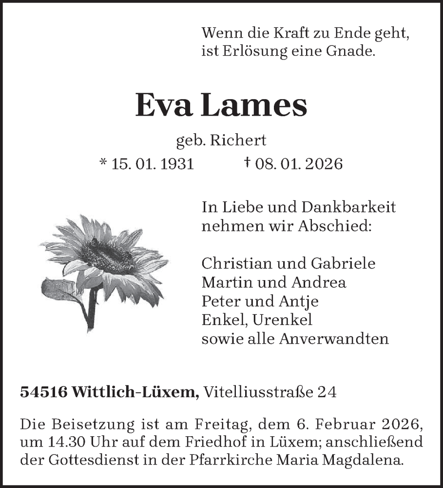 Hier finden Sie alle Traueranzeigen aus der Zeitung, die bisher für Eva Lames erschienen sind. Weitere Traueranzeigen, die in der Zeitung erscheinen, werden hier ebenfalls aufgelistet