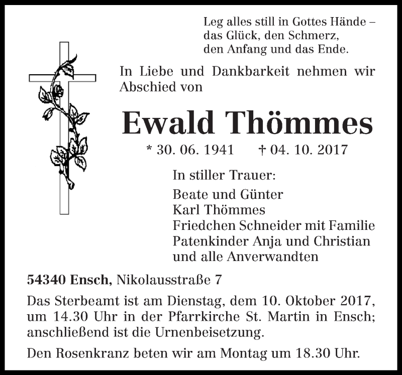 Hier finden Sie alle Traueranzeigen aus der Zeitung, die bisher für Ewald Thömmes erschienen sind. Weitere Traueranzeigen, die in der Zeitung erscheinen, werden hier ebenfalls aufgelistet
