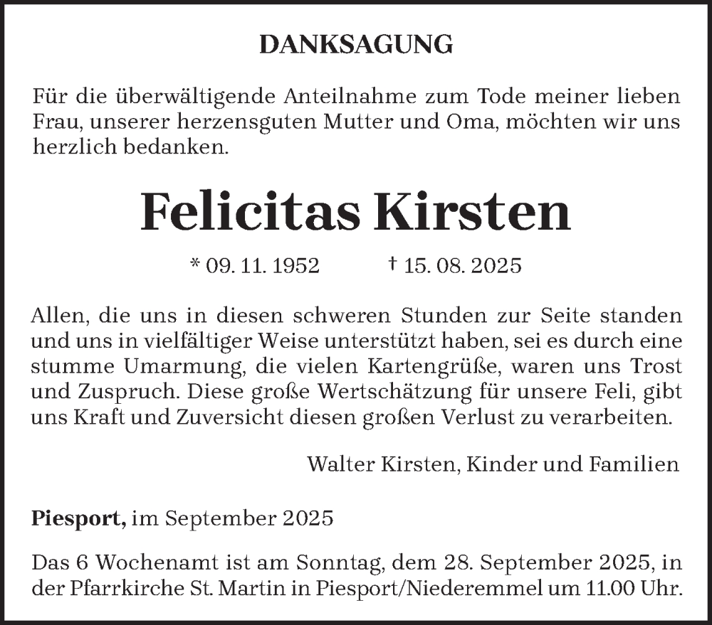 Hier finden Sie alle Traueranzeigen aus der Zeitung, die bisher für Felicitas Kirsten erschienen sind. Weitere Traueranzeigen, die in der Zeitung erscheinen, werden hier ebenfalls aufgelistet
