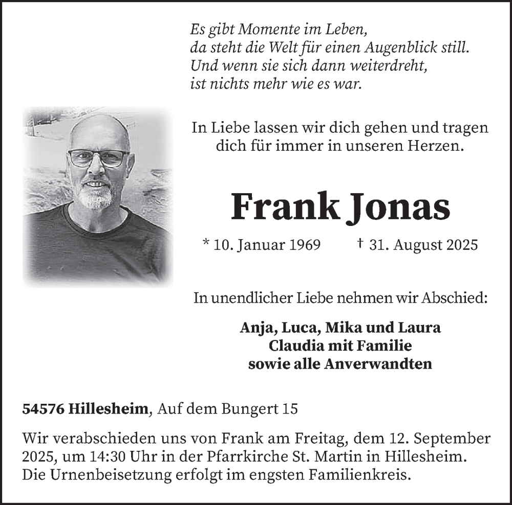 Hier finden Sie alle Traueranzeigen aus der Zeitung, die bisher für Frank Jonas erschienen sind. Weitere Traueranzeigen, die in der Zeitung erscheinen, werden hier ebenfalls aufgelistet