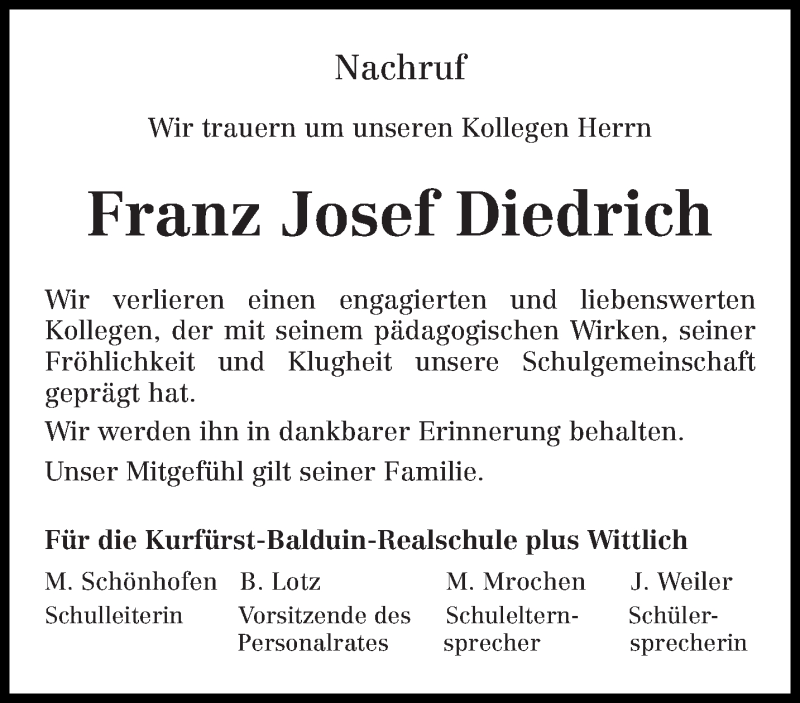 Hier finden Sie alle Traueranzeigen aus der Zeitung, die bisher für Franz-Josef Diedrich erschienen sind. Weitere Traueranzeigen, die in der Zeitung erscheinen, werden hier ebenfalls aufgelistet