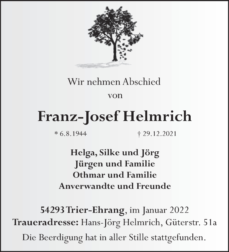 Hier finden Sie alle Traueranzeigen aus der Zeitung, die bisher für Franz-Josef Helmrich erschienen sind. Weitere Traueranzeigen, die in der Zeitung erscheinen, werden hier ebenfalls aufgelistet