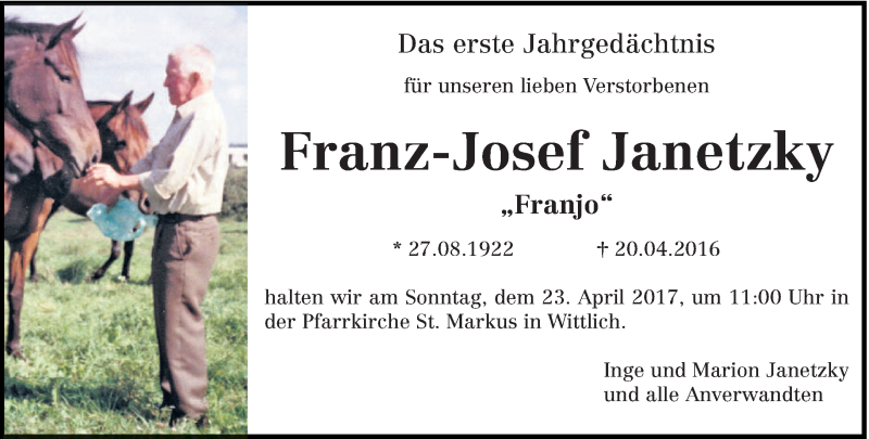 Hier finden Sie alle Traueranzeigen aus der Zeitung, die bisher für Franz-Josef Janetzky erschienen sind. Weitere Traueranzeigen, die in der Zeitung erscheinen, werden hier ebenfalls aufgelistet