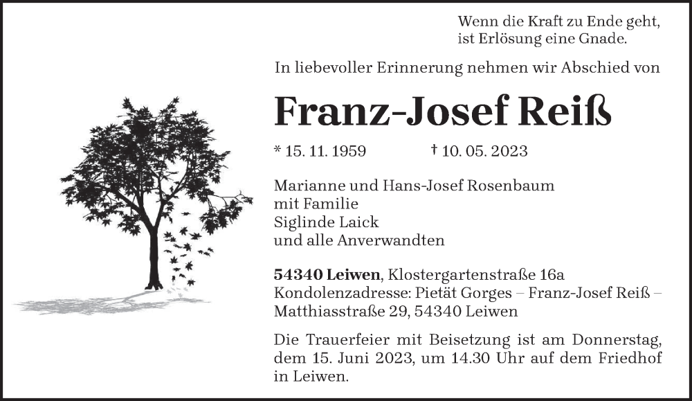 Hier finden Sie alle Traueranzeigen aus der Zeitung, die bisher für Franz-Josef Reiß erschienen sind. Weitere Traueranzeigen, die in der Zeitung erscheinen, werden hier ebenfalls aufgelistet