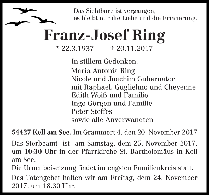 Hier finden Sie alle Traueranzeigen aus der Zeitung, die bisher für Franz-Josef Ring erschienen sind. Weitere Traueranzeigen, die in der Zeitung erscheinen, werden hier ebenfalls aufgelistet