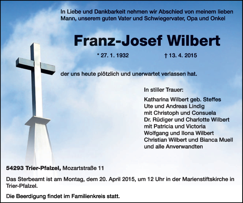 Hier finden Sie alle Traueranzeigen aus der Zeitung, die bisher für Franz-Josef Wilbert erschienen sind. Weitere Traueranzeigen, die in der Zeitung erscheinen, werden hier ebenfalls aufgelistet