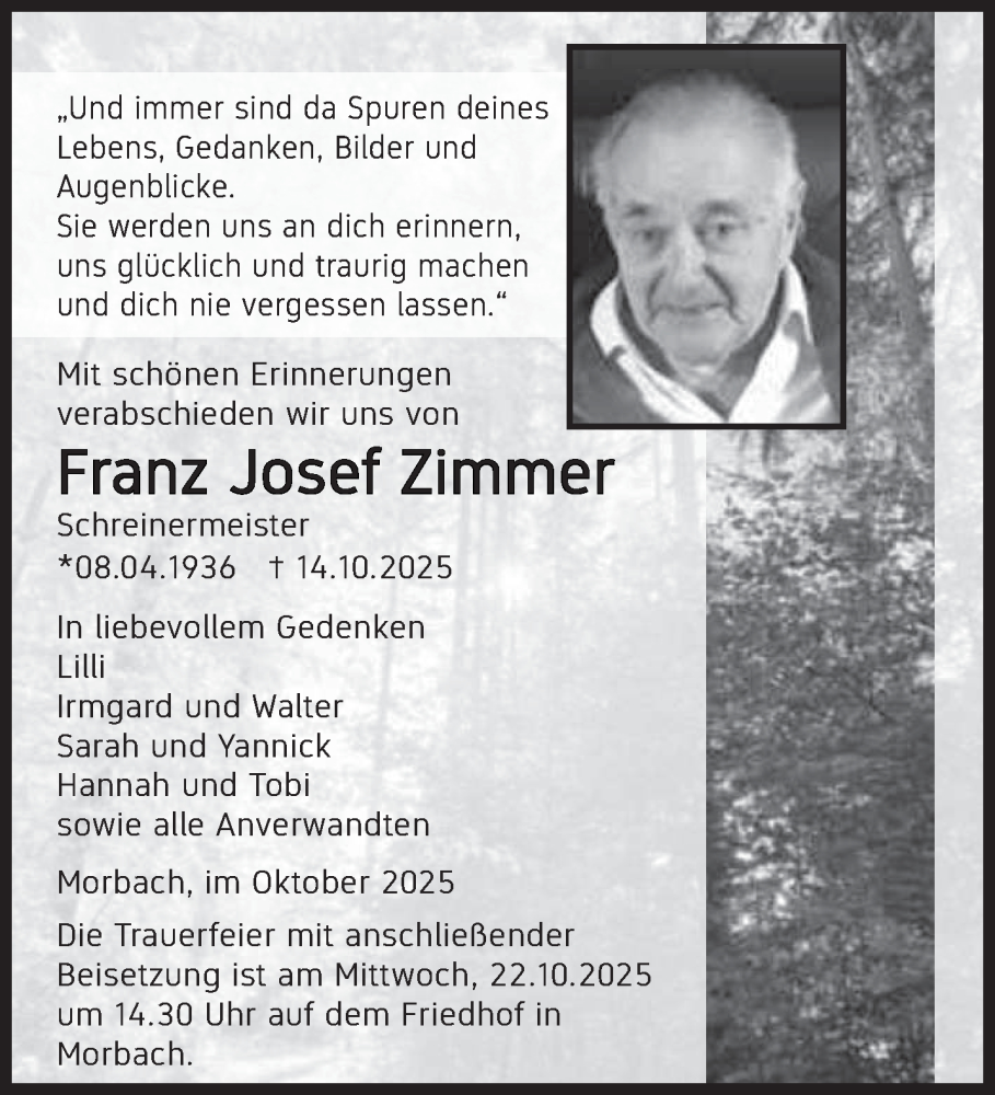 Hier finden Sie alle Traueranzeigen aus der Zeitung, die bisher für Franz Josef Zimmer erschienen sind. Weitere Traueranzeigen, die in der Zeitung erscheinen, werden hier ebenfalls aufgelistet