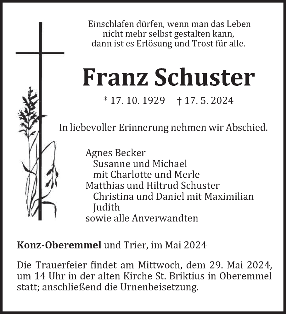 Hier finden Sie alle Traueranzeigen aus der Zeitung, die bisher für Franz Schuster erschienen sind. Weitere Traueranzeigen, die in der Zeitung erscheinen, werden hier ebenfalls aufgelistet
