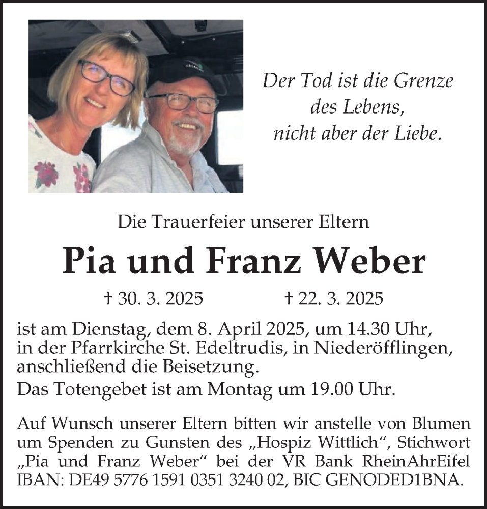 Hier finden Sie alle Traueranzeigen aus der Zeitung, die bisher für Franz Weber erschienen sind. Weitere Traueranzeigen, die in der Zeitung erscheinen, werden hier ebenfalls aufgelistet