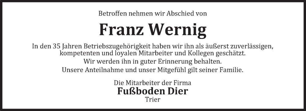 Hier finden Sie alle Traueranzeigen aus der Zeitung, die bisher für Franz Wernig erschienen sind. Weitere Traueranzeigen, die in der Zeitung erscheinen, werden hier ebenfalls aufgelistet