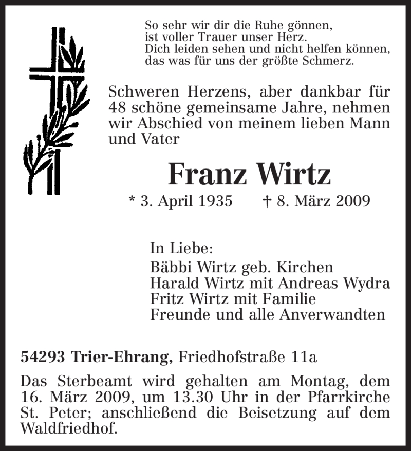 Hier finden Sie alle Traueranzeigen aus der Zeitung, die bisher für Franz Wirtz erschienen sind. Weitere Traueranzeigen, die in der Zeitung erscheinen, werden hier ebenfalls aufgelistet