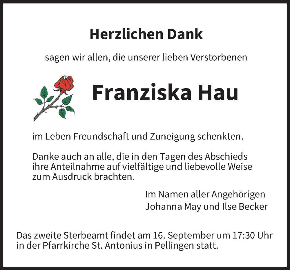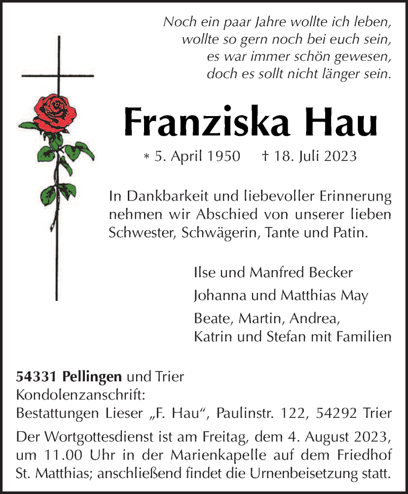 Hier finden Sie alle Traueranzeigen aus der Zeitung, die bisher für Franziska Hau erschienen sind. Weitere Traueranzeigen, die in der Zeitung erscheinen, werden hier ebenfalls aufgelistet
