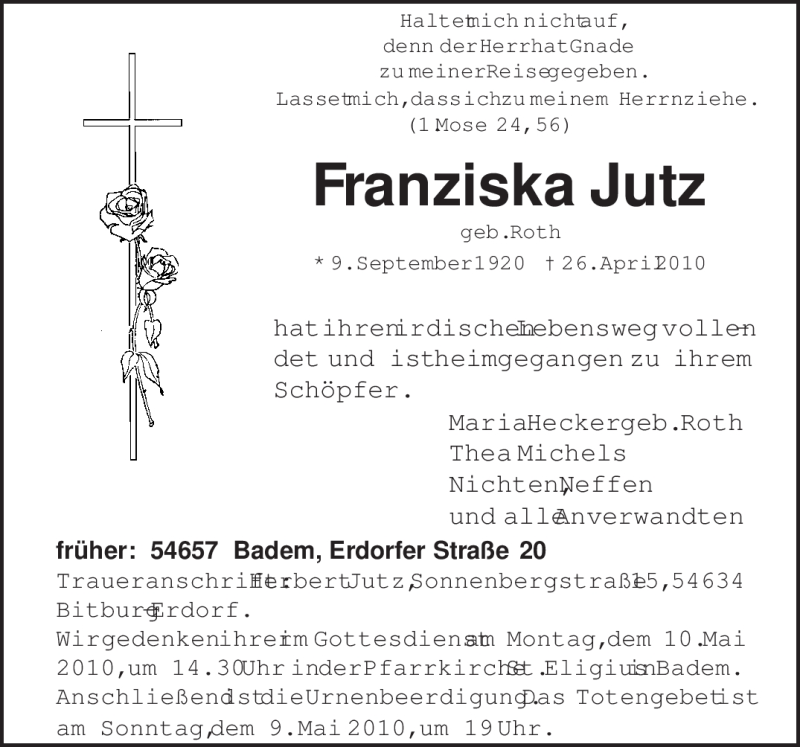 Hier finden Sie alle Traueranzeigen aus der Zeitung, die bisher für Franziska Jutz erschienen sind. Weitere Traueranzeigen, die in der Zeitung erscheinen, werden hier ebenfalls aufgelistet