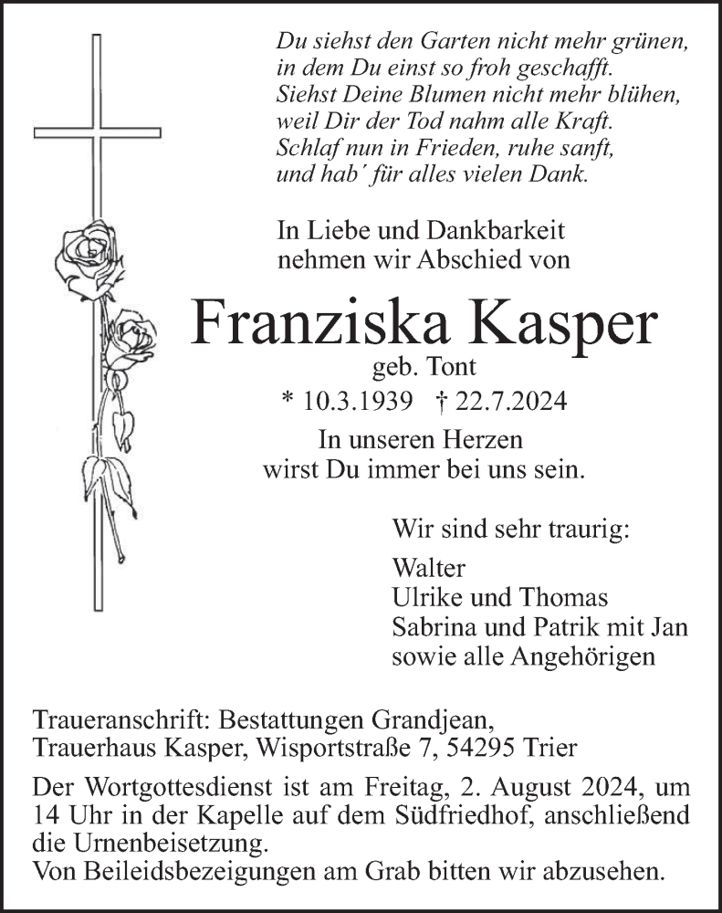 Hier finden Sie alle Traueranzeigen aus der Zeitung, die bisher für Franziska Kasper erschienen sind. Weitere Traueranzeigen, die in der Zeitung erscheinen, werden hier ebenfalls aufgelistet