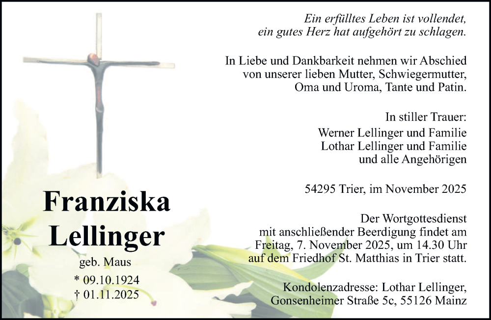 Hier finden Sie alle Traueranzeigen aus der Zeitung, die bisher für Franziska Lellinger erschienen sind. Weitere Traueranzeigen, die in der Zeitung erscheinen, werden hier ebenfalls aufgelistet