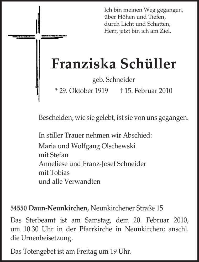 Hier finden Sie alle Traueranzeigen aus der Zeitung, die bisher für Franziska Schüller erschienen sind. Weitere Traueranzeigen, die in der Zeitung erscheinen, werden hier ebenfalls aufgelistet