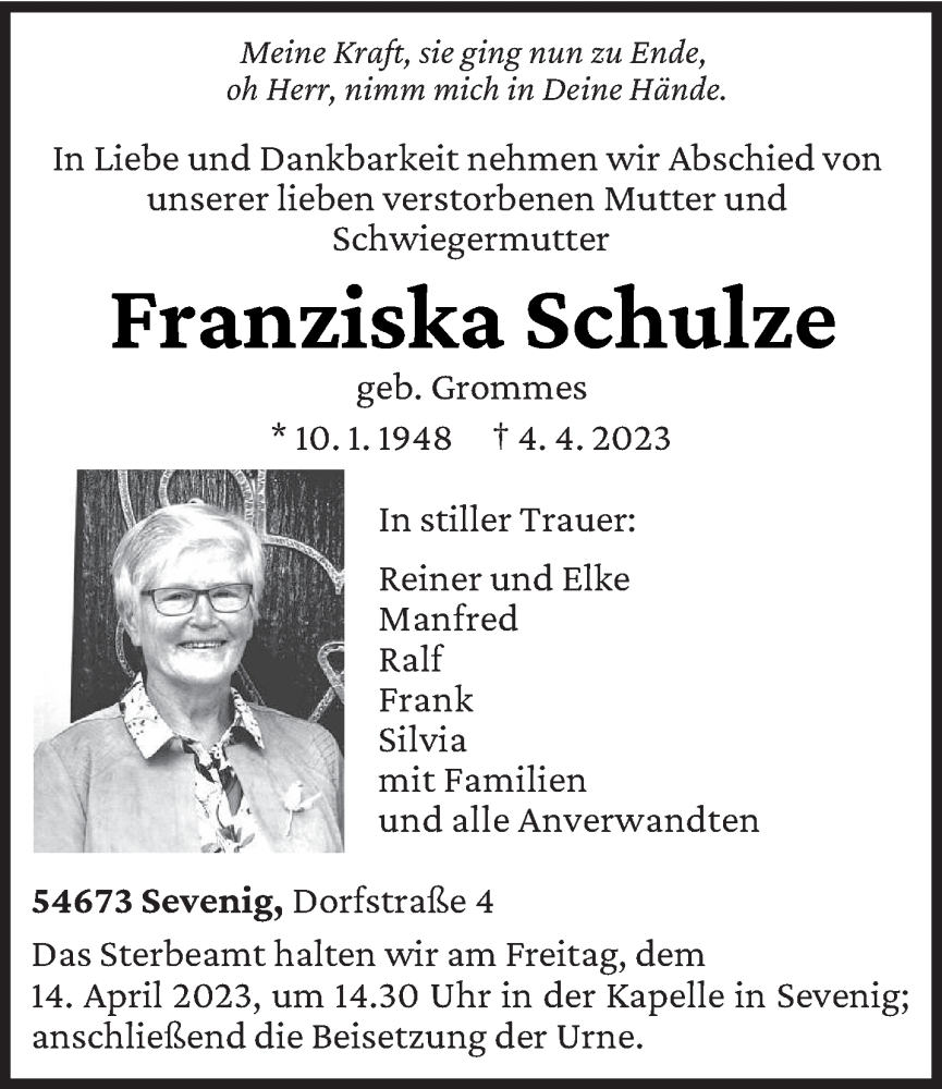 Hier finden Sie alle Traueranzeigen aus der Zeitung, die bisher für Franziska Schulze erschienen sind. Weitere Traueranzeigen, die in der Zeitung erscheinen, werden hier ebenfalls aufgelistet