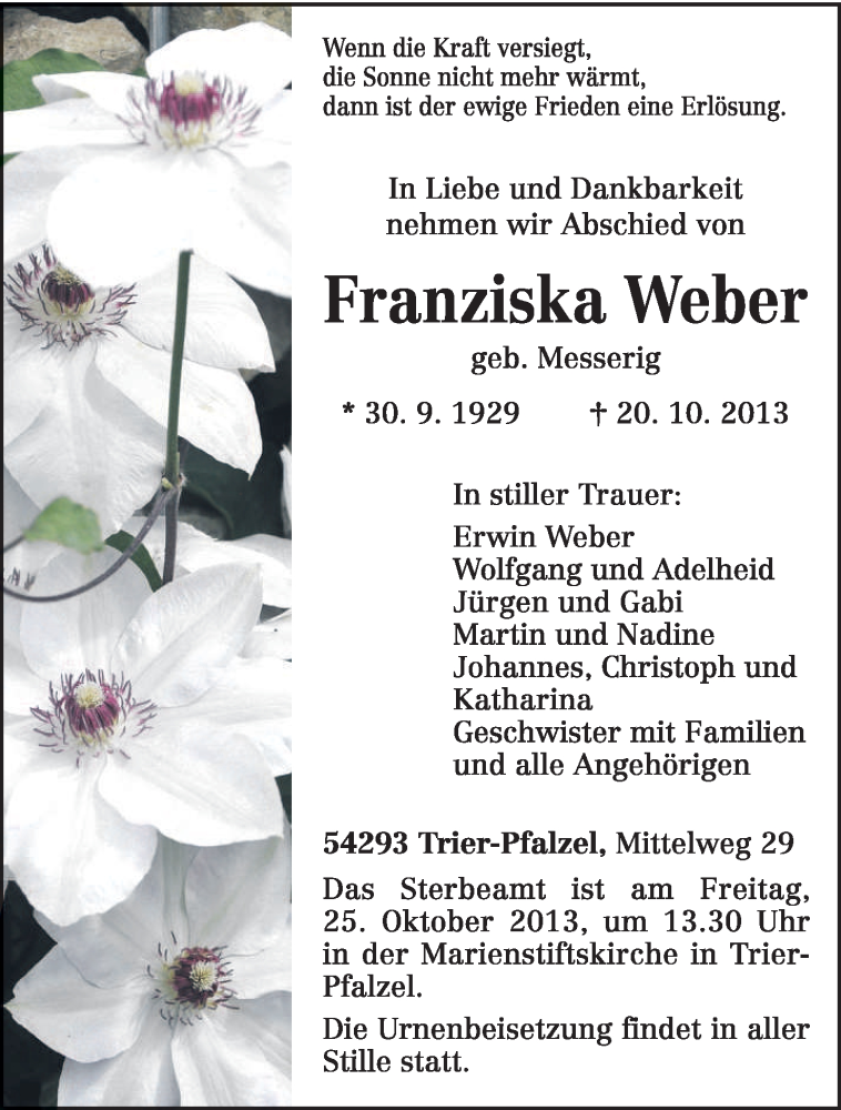 Hier finden Sie alle Traueranzeigen aus der Zeitung, die bisher für Franziska Weber erschienen sind. Weitere Traueranzeigen, die in der Zeitung erscheinen, werden hier ebenfalls aufgelistet