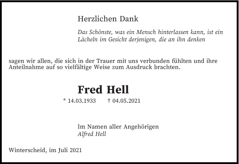 Hier finden Sie alle Traueranzeigen aus der Zeitung, die bisher für Fred Hell erschienen sind. Weitere Traueranzeigen, die in der Zeitung erscheinen, werden hier ebenfalls aufgelistet