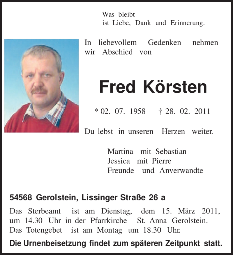 Hier finden Sie alle Traueranzeigen aus der Zeitung, die bisher für Fred Körsten erschienen sind. Weitere Traueranzeigen, die in der Zeitung erscheinen, werden hier ebenfalls aufgelistet