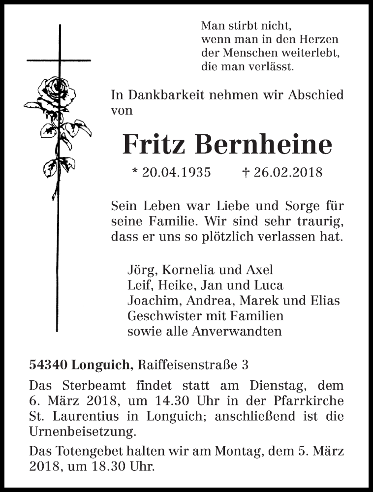 Hier finden Sie alle Traueranzeigen aus der Zeitung, die bisher für Fritz Bernheine erschienen sind. Weitere Traueranzeigen, die in der Zeitung erscheinen, werden hier ebenfalls aufgelistet