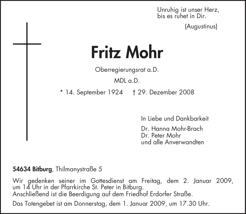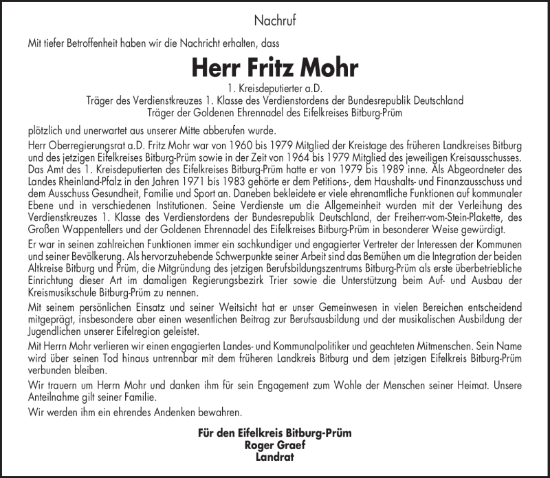 Hier finden Sie alle Traueranzeigen aus der Zeitung, die bisher für Fritz Mohr erschienen sind. Weitere Traueranzeigen, die in der Zeitung erscheinen, werden hier ebenfalls aufgelistet