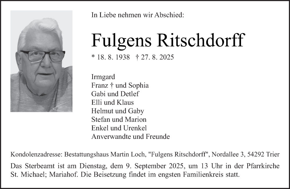 Hier finden Sie alle Traueranzeigen aus der Zeitung, die bisher für Fulgens Ritschdorff erschienen sind. Weitere Traueranzeigen, die in der Zeitung erscheinen, werden hier ebenfalls aufgelistet
