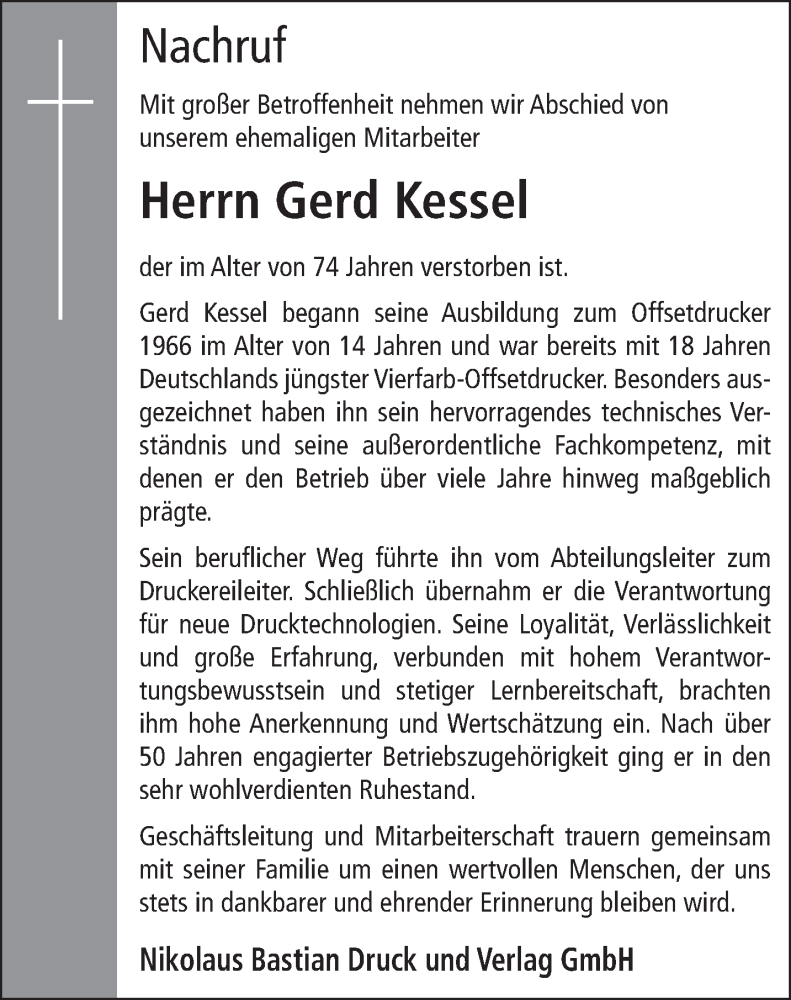 Hier finden Sie alle Traueranzeigen aus der Zeitung, die bisher für Gerd Kessel erschienen sind. Weitere Traueranzeigen, die in der Zeitung erscheinen, werden hier ebenfalls aufgelistet