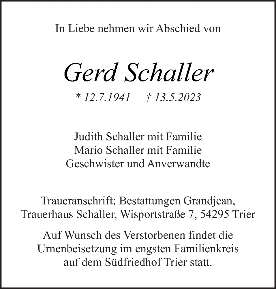 Hier finden Sie alle Traueranzeigen aus der Zeitung, die bisher für Gerd Schaller erschienen sind. Weitere Traueranzeigen, die in der Zeitung erscheinen, werden hier ebenfalls aufgelistet