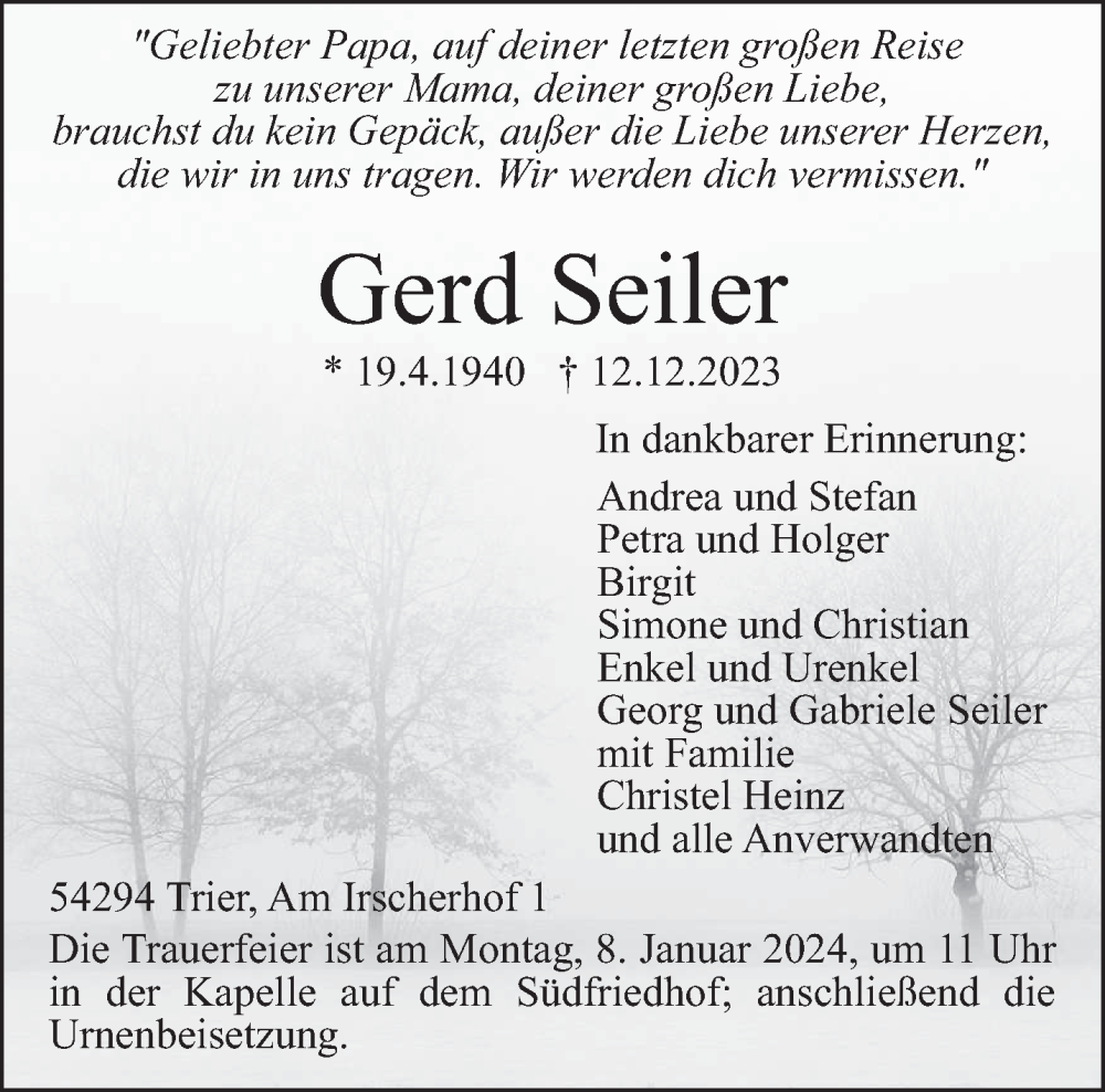 Hier finden Sie alle Traueranzeigen aus der Zeitung, die bisher für Gerd Seiler erschienen sind. Weitere Traueranzeigen, die in der Zeitung erscheinen, werden hier ebenfalls aufgelistet