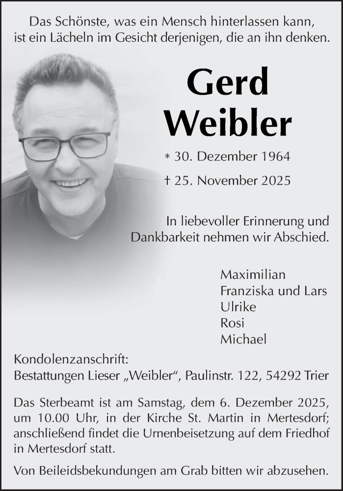 Hier finden Sie alle Traueranzeigen aus der Zeitung, die bisher für Gerd Weibler erschienen sind. Weitere Traueranzeigen, die in der Zeitung erscheinen, werden hier ebenfalls aufgelistet