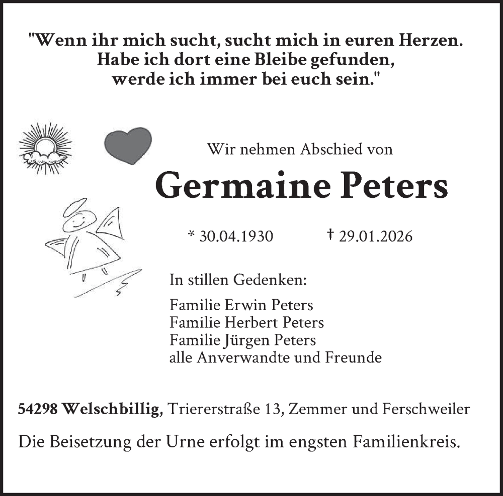 Hier finden Sie alle Traueranzeigen aus der Zeitung, die bisher für Germaine Peters erschienen sind. Weitere Traueranzeigen, die in der Zeitung erscheinen, werden hier ebenfalls aufgelistet