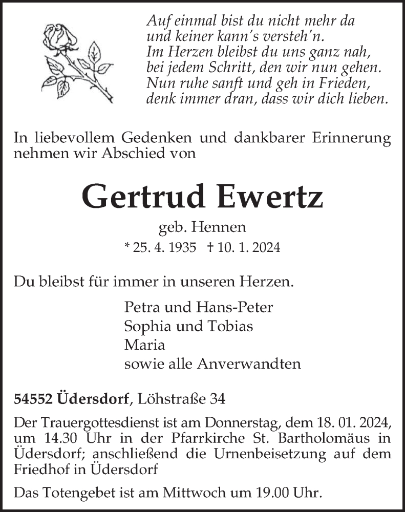 Hier finden Sie alle Traueranzeigen aus der Zeitung, die bisher für Gertrud Ewertz erschienen sind. Weitere Traueranzeigen, die in der Zeitung erscheinen, werden hier ebenfalls aufgelistet