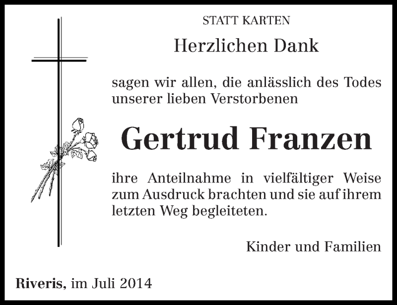 Hier finden Sie alle Traueranzeigen aus der Zeitung, die bisher für Gertrud Franzen erschienen sind. Weitere Traueranzeigen, die in der Zeitung erscheinen, werden hier ebenfalls aufgelistet