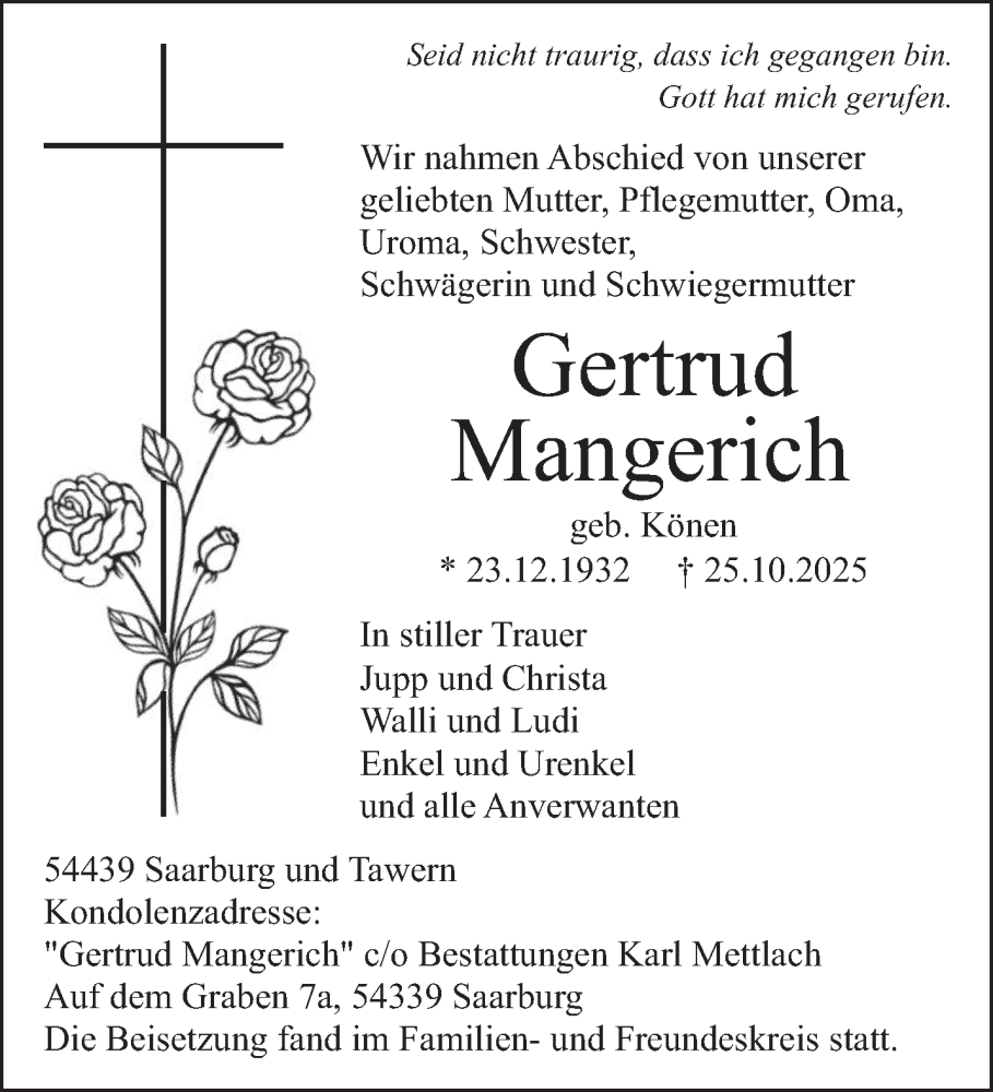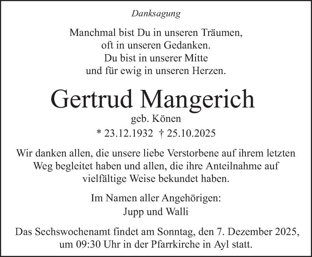 Hier finden Sie alle Traueranzeigen aus der Zeitung, die bisher für Gertrud Mangerich erschienen sind. Weitere Traueranzeigen, die in der Zeitung erscheinen, werden hier ebenfalls aufgelistet